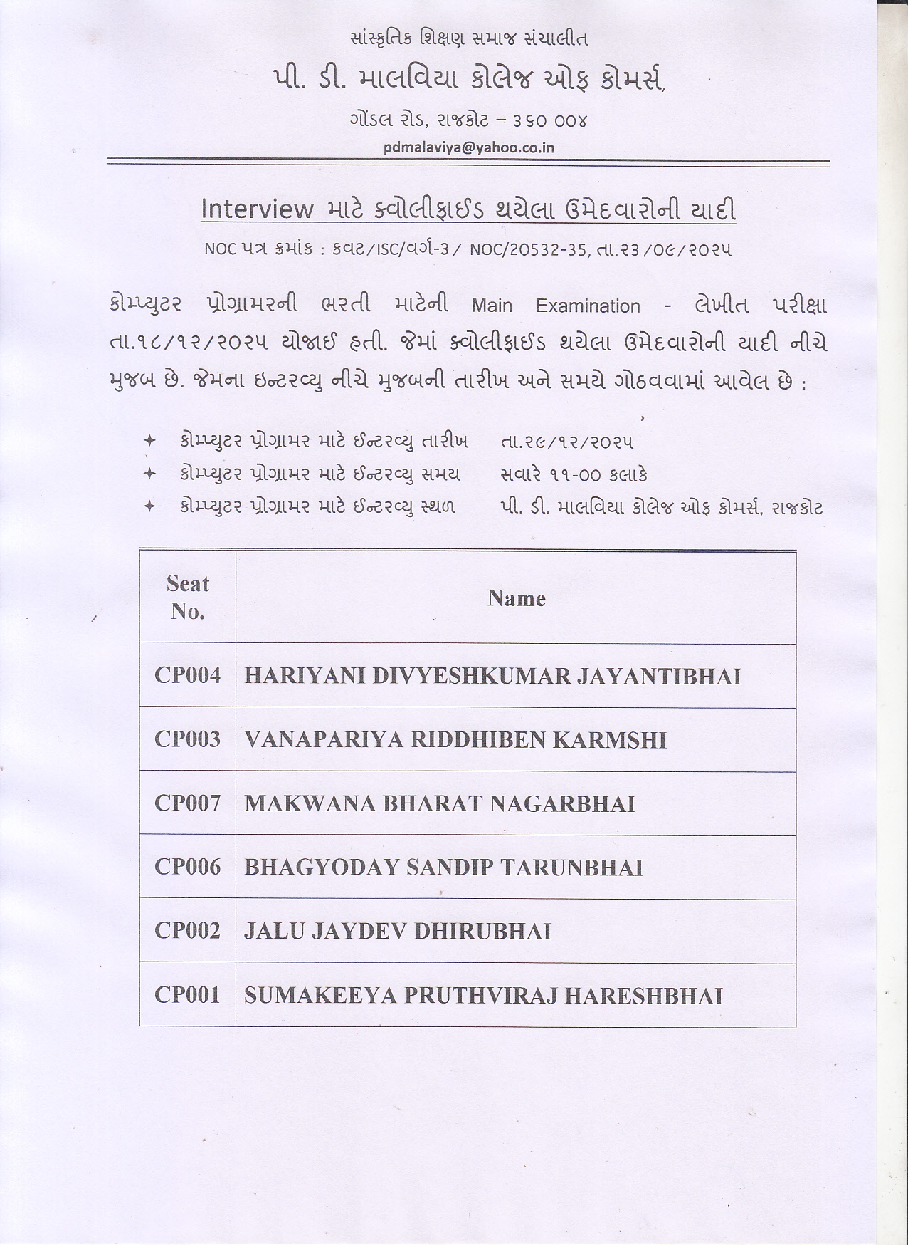 LIST OF CANDIDATES - QUALIFIED FOR INTERVIEW IN COMPUTER PROGRAMMER POST  ComputerProgrammerResult18122025.jpg